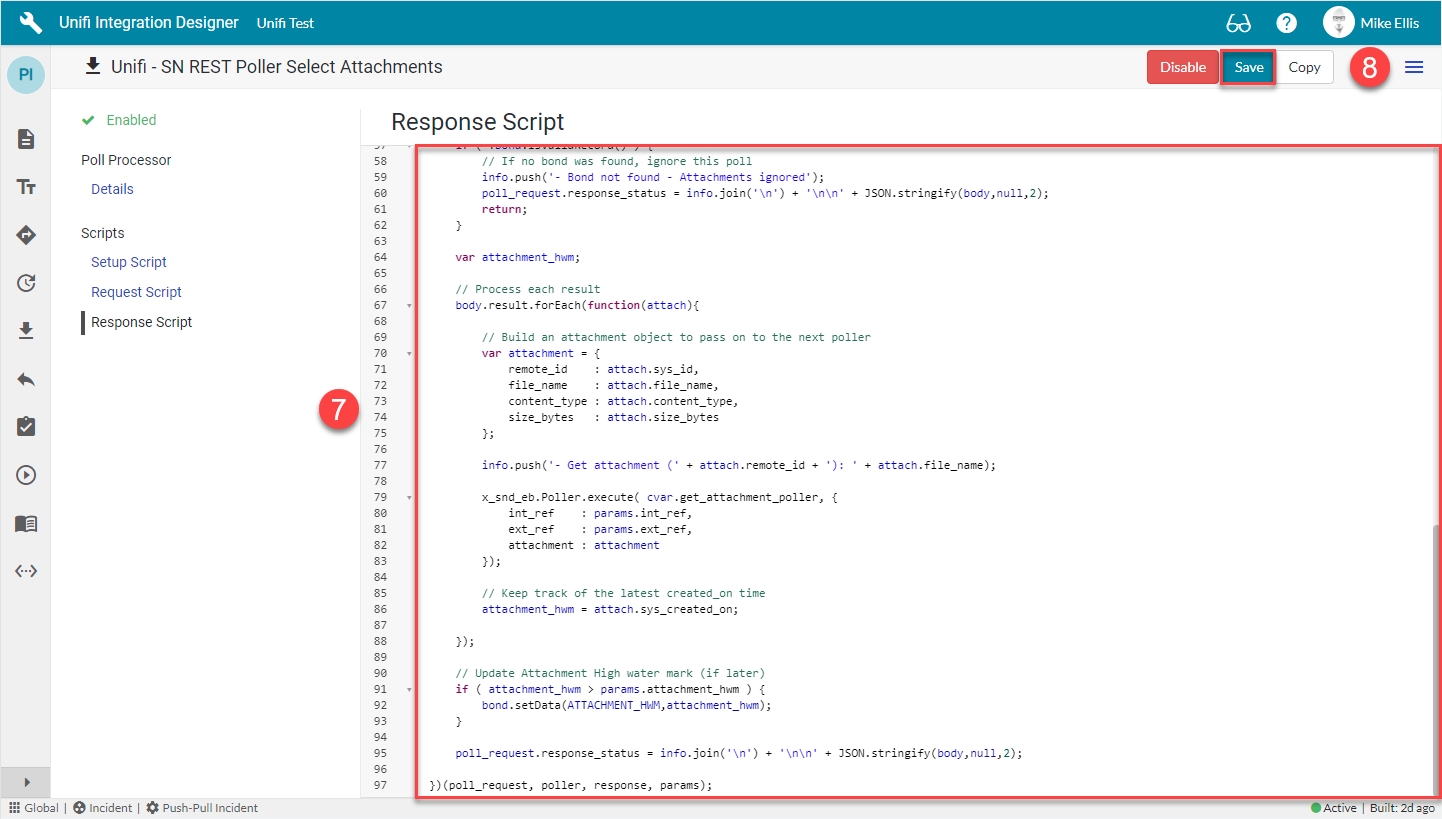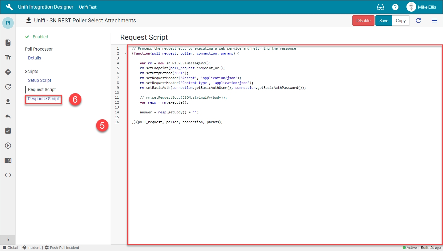 The Response Script is used to process the information returned from the remote system. We will use it to build an attachment object to pass this data to the next Poll Processor.