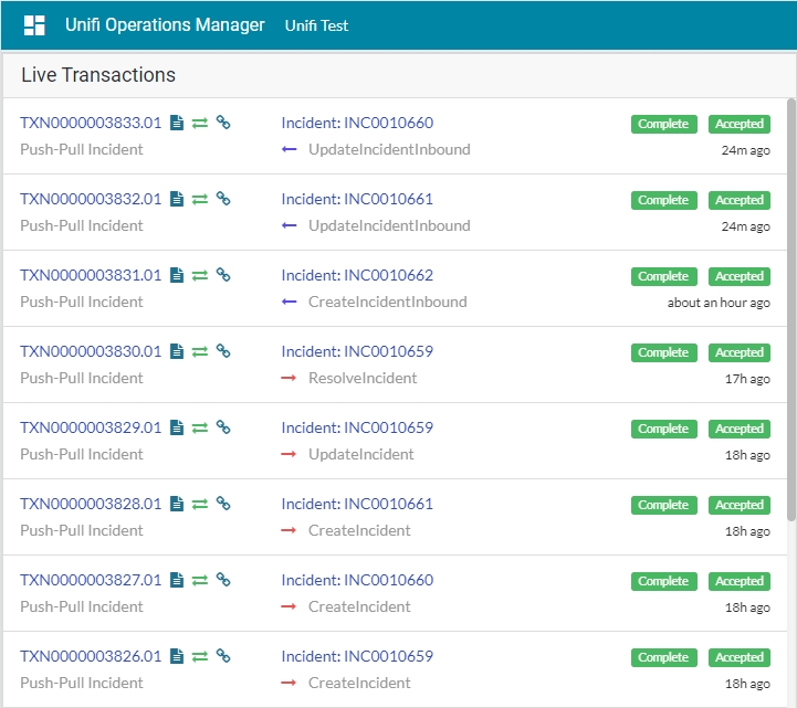 View the Transactions that have been sent. This can be done either in Native ServiceNow, or in Unifi Operations Manager.