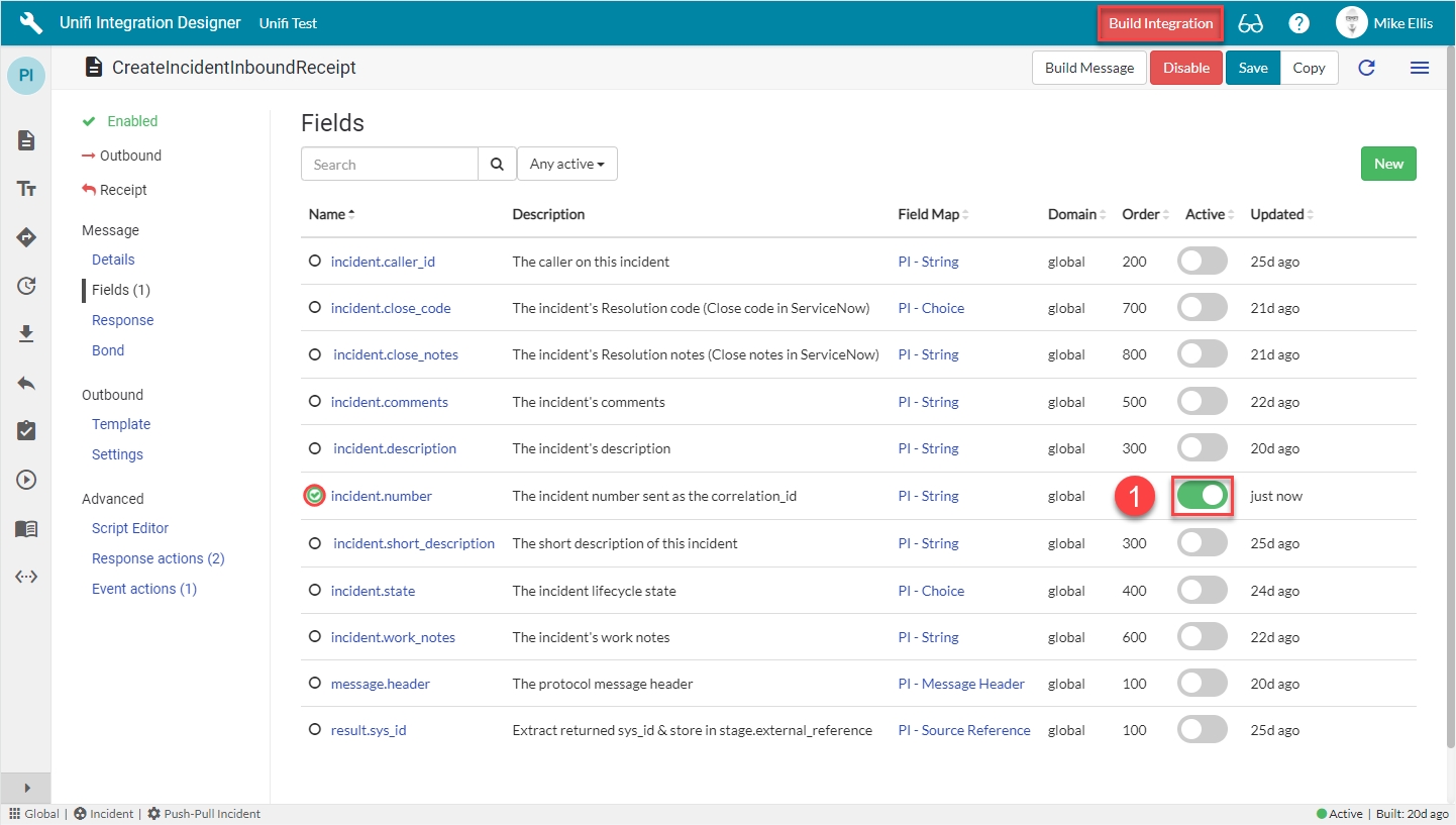 The ‘Build Integration’ button becomes visible in the banner and the empty circle icon next to the Field name turns green & contains a green ‘check’ (to indicate that Message level configuration exists for this Field) when we set Active to true. (Note: the empty 'circle icon' indicates that the Integration level Field is available to add to the Message.).