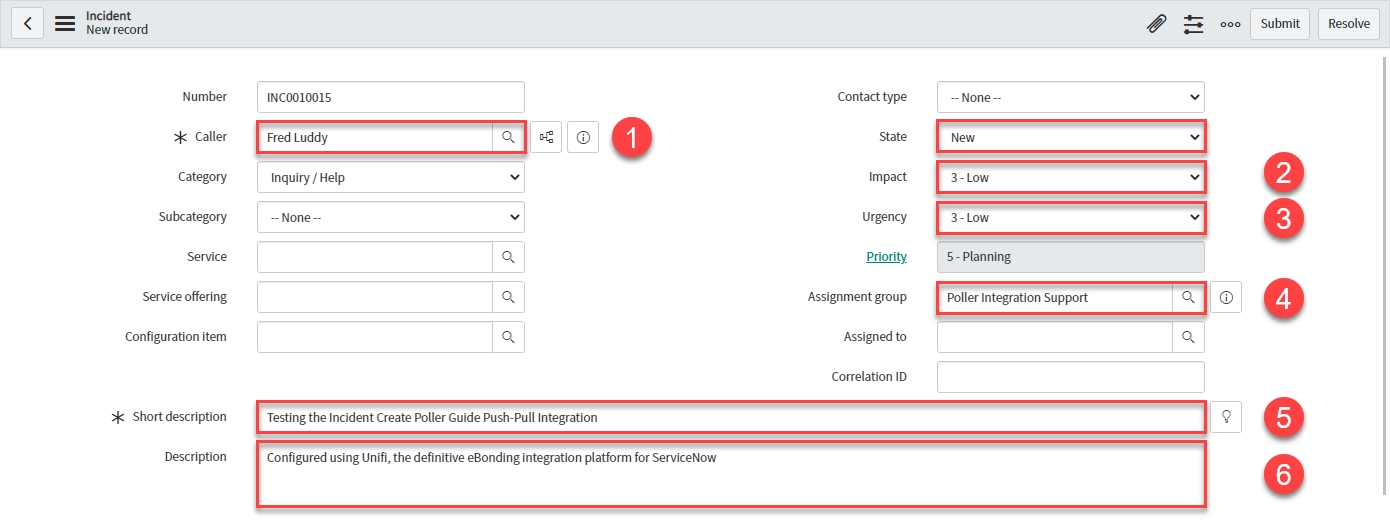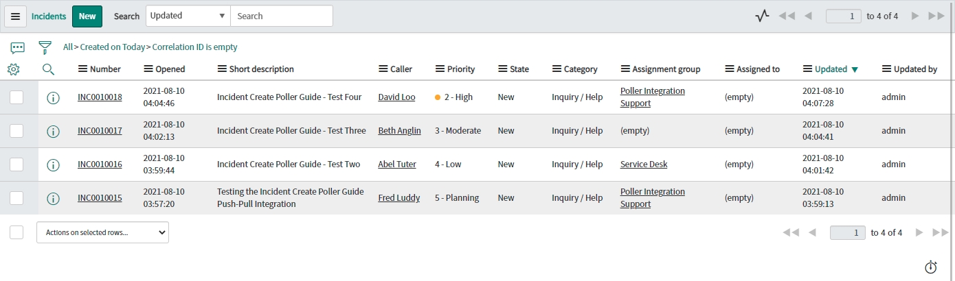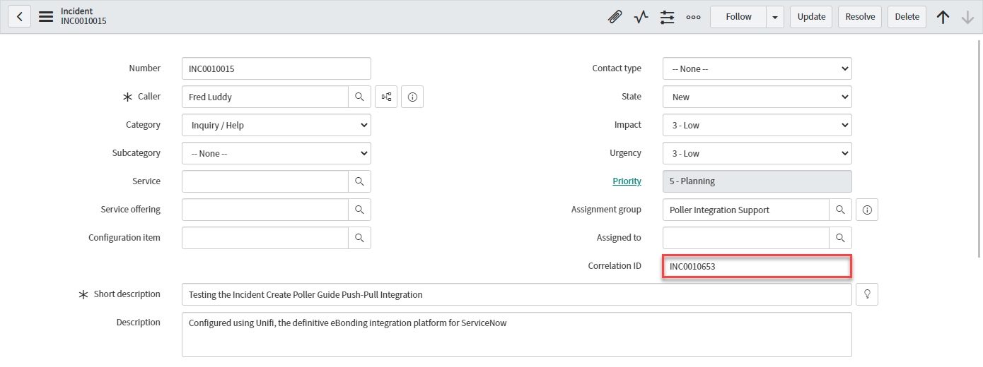 In native ServiceNow, navigate to Unifi > Polling > Poll Requests. Click to Open & view the generated Poll Request. Confirm that only the two Incidents were found (this is exactly as we expect because we are only polling for Incidents assigned to a specific Assignment group):