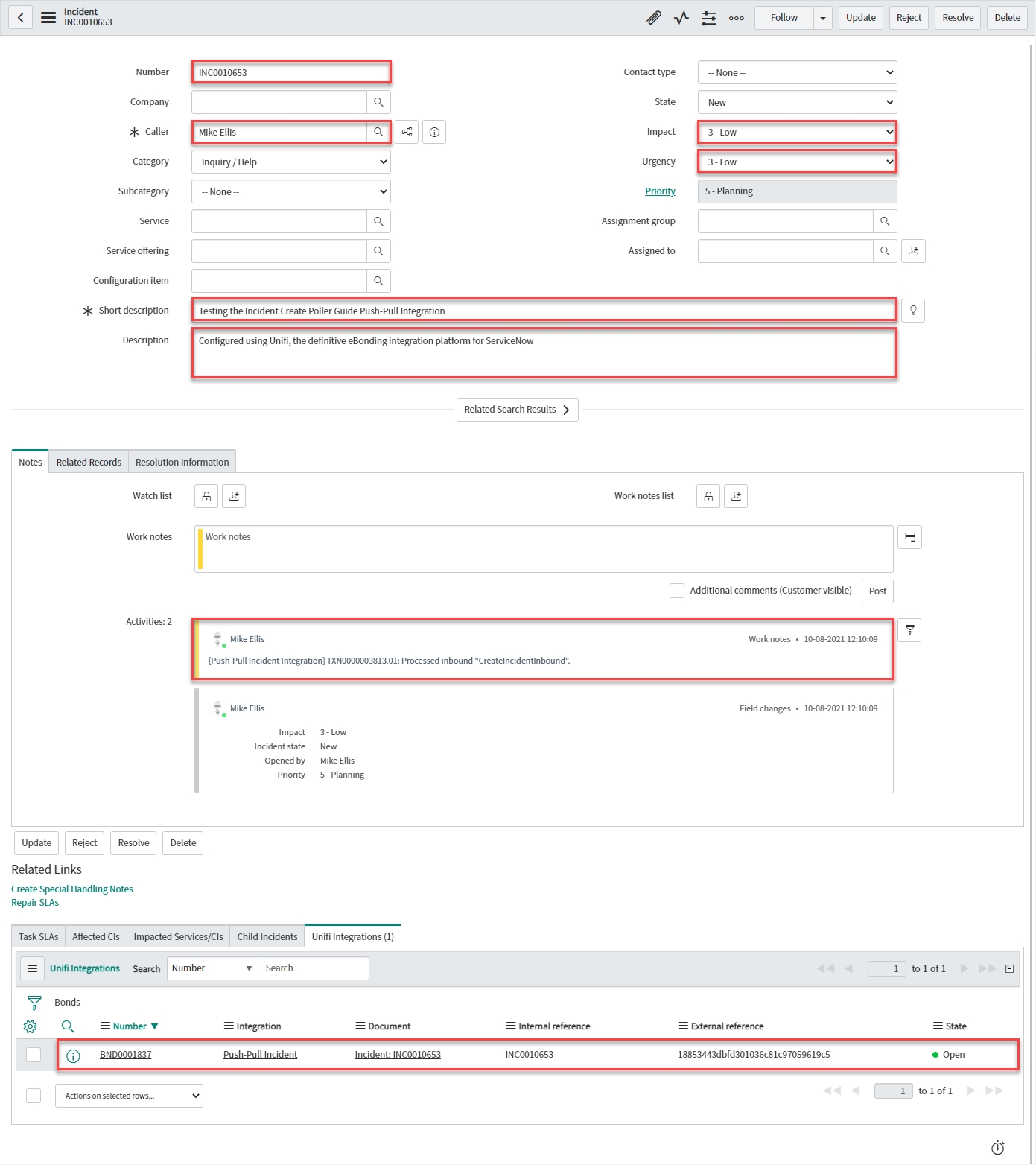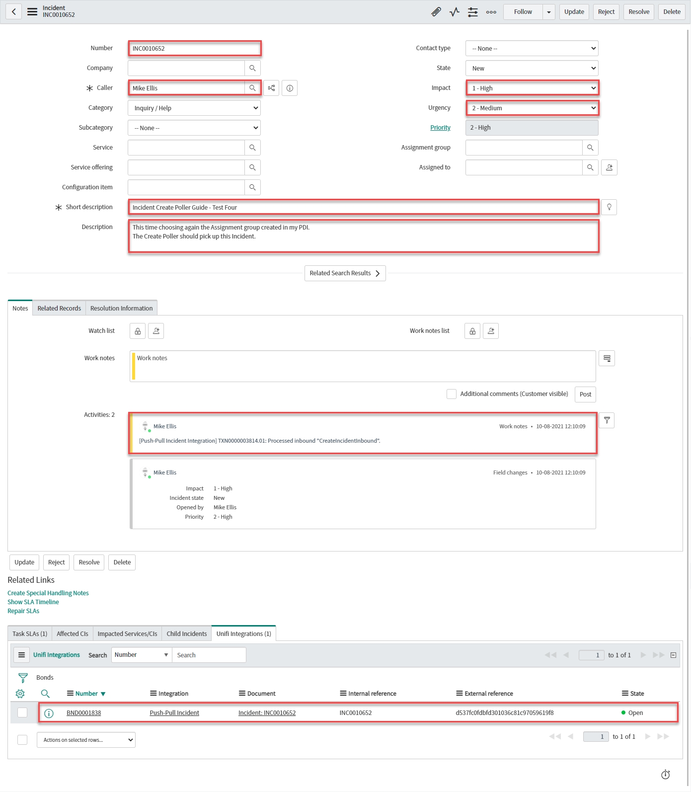 For completeness, to prove we are only querying and pulling back data from non-bonded records, create an incident in this instance which causes the outbound CreateIncident Message to fire - as per the Outbound Incident Guide - (creating a new Incident in the remote instance) & run the Poller again.