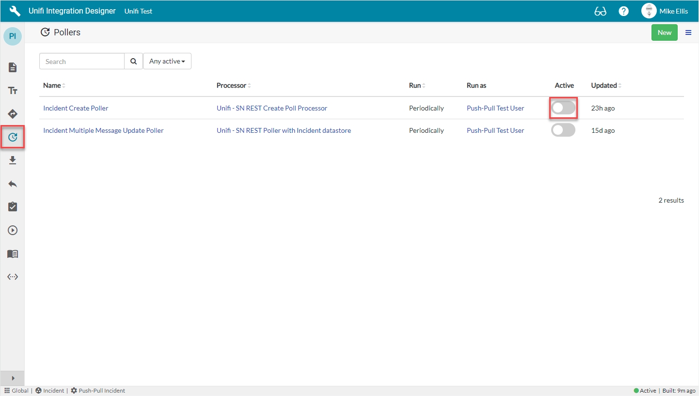 To turn off the Poller, in the Unifi Integration Designer window, navigate to the 'Pollers' icon & set Active to false.