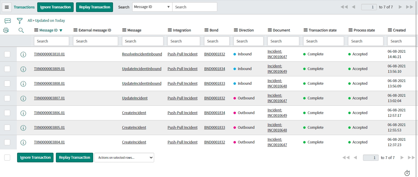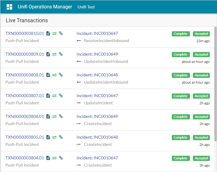 View the Transactions that have been sent. This can be done either in Native ServiceNow, or in Unifi Operations Manager.