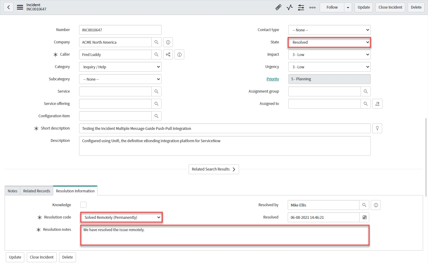 Update the Incident record as follows:
