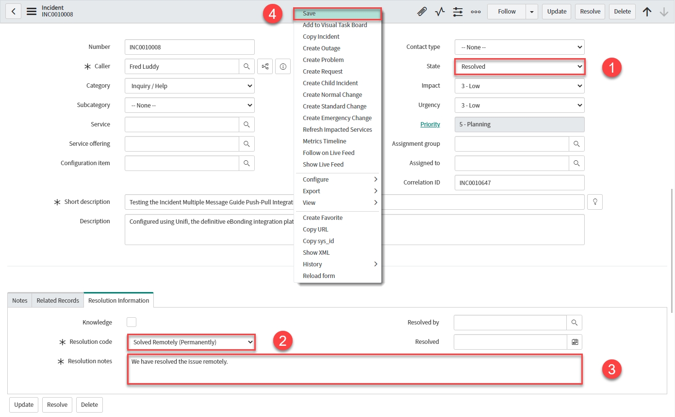 Follow these steps to test the ResolveIncidentInbound Message.