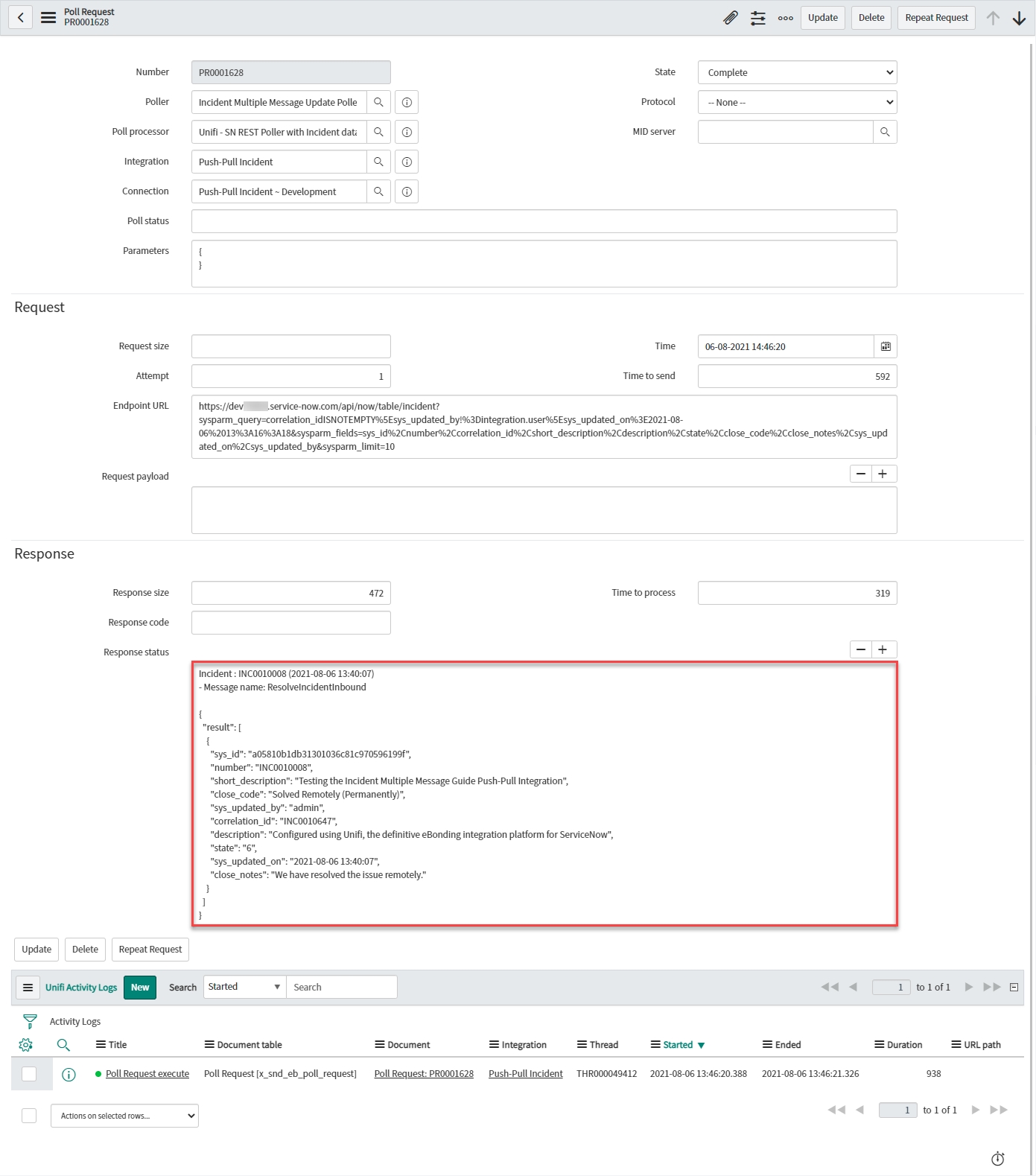 Open the corresponding Poll Request & confirm that the Incident was found (and the Message name was ResolveIncidentInbound):