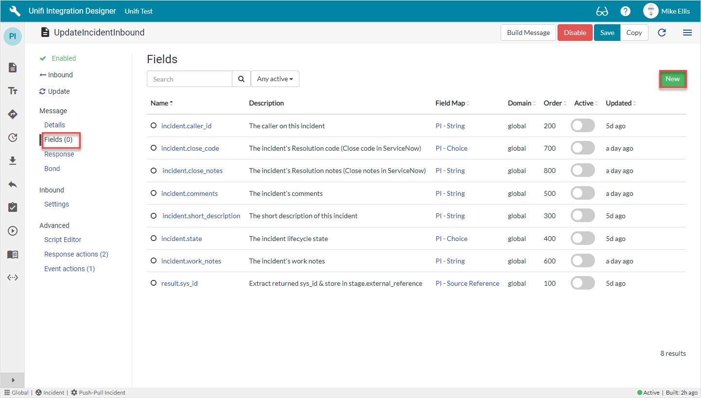 Back in the UpdateIncidentInbound Message, navigate to Message > Fields. Click New.