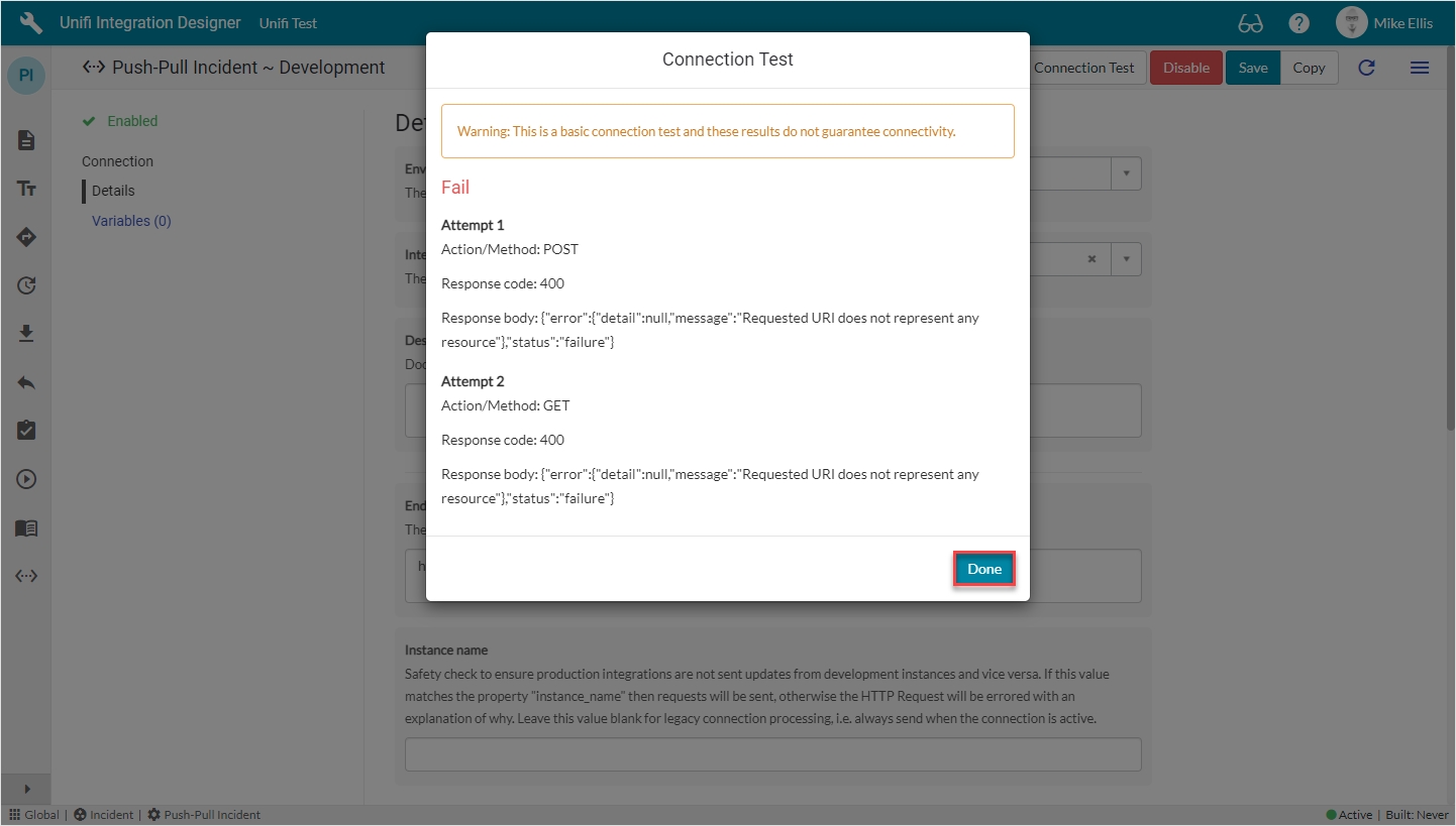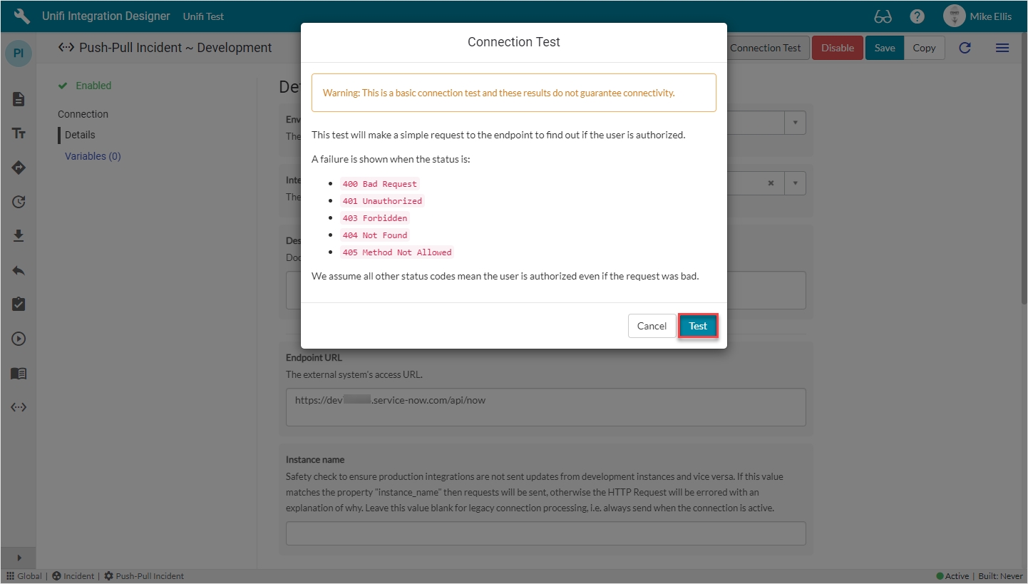 Then, on the Connection Test modal, click Test.