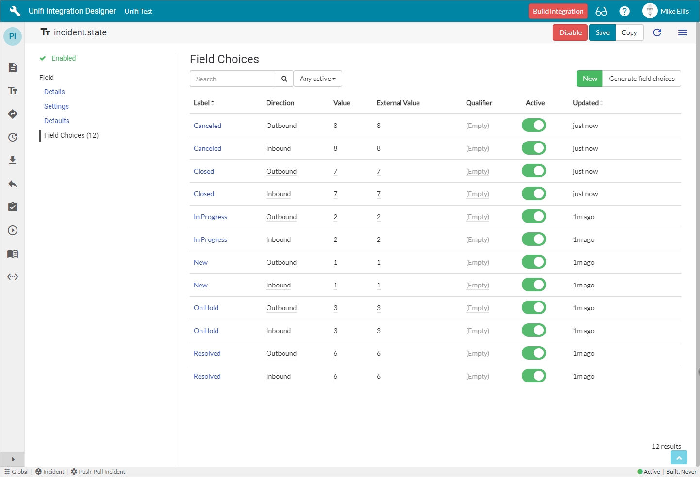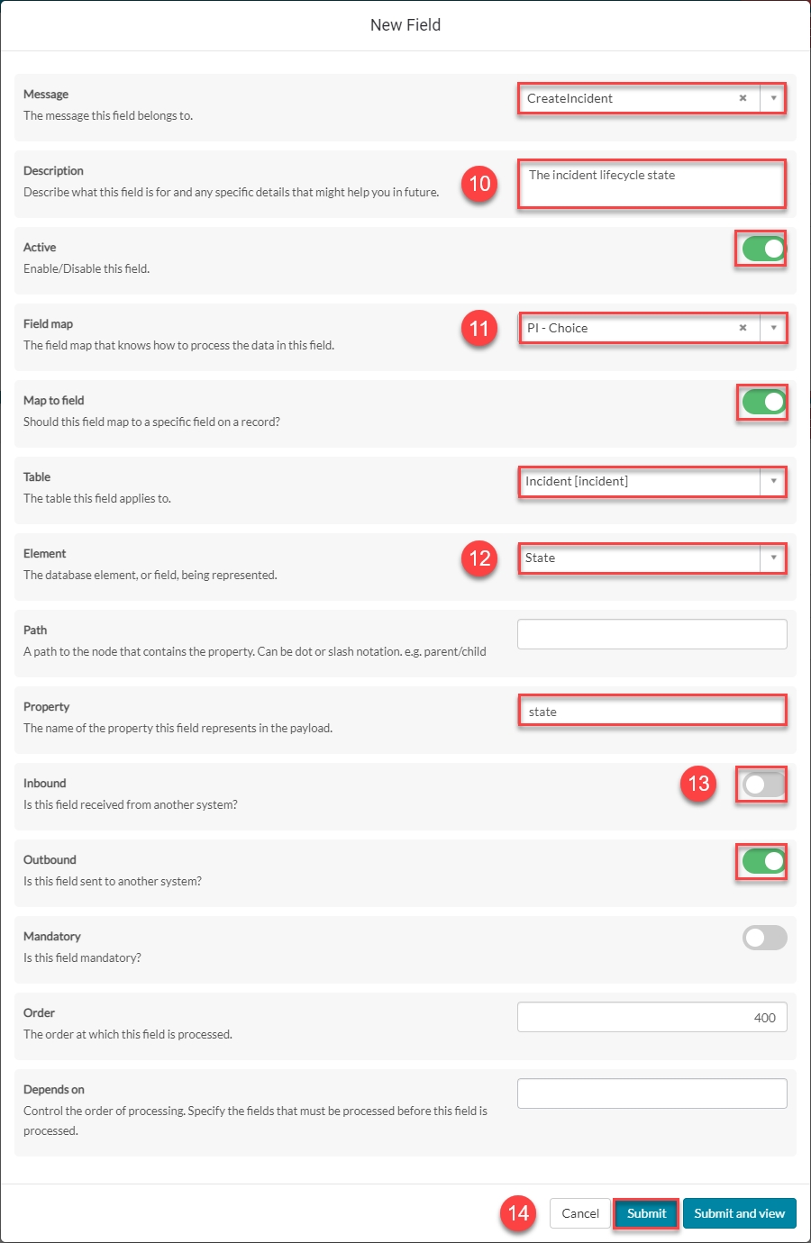 Field records can exist at both the Integration and the Message level (a Field record exists at the Integration level if it isn't linked to a Message i.e. the 'Message' field element is left blank). We noted previously that an Integration level Field record is automatically created when we create one at the Message level. We will utilise and configure both when mapping 'incident.state'.