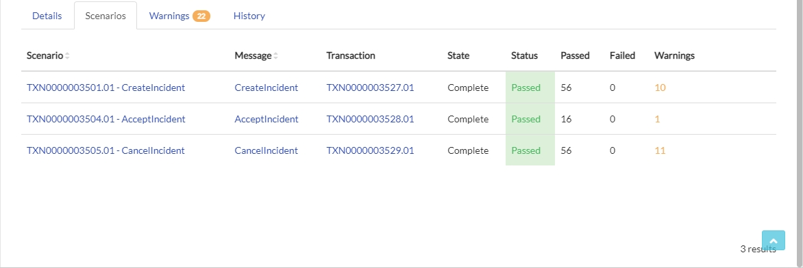 The Scenarios tab shows each of the Integration Test Scenario Results. Clicking the Scenario link will open the Result for that Integration Test Scenario. Clicking the Transaction link will open the Transaction record created during the test run.