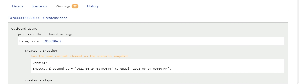 The Warnings tab shows all the warnings grouped by each Integration Test Scenario Result. From here you can step into each of the relevant Results and the relevant 'Transport Stack' records (e.g. Stage, Request, Bond, Snapshot).