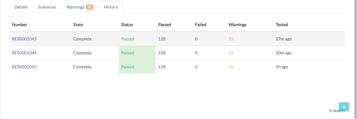 The History tab shows a list of the results of each test run. Each time a Test is run, the Result will be added to the top of this list. Clicking the value in the Number column will display the relevant Integration Test Result above.
