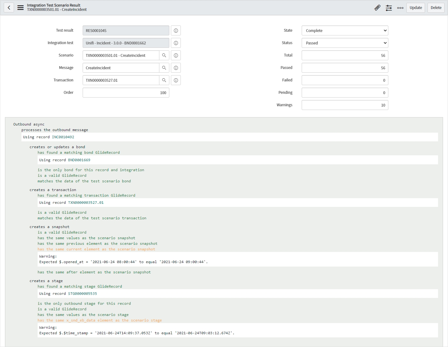 You can step into each Integration Test Scenario Result from either the Scenarios or Warnings tabs. Clicking the link will open it in a new window. An example is shown below.